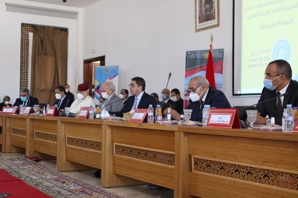 وفي مداخلته، نوه السيد إدريس أوعويشة، الوزير المنتدب المكلف بالتعليم العالي والبحث العلمي بالعمل الذي تقوم به جامعة ابن زهر بهذه الجهة التي وصفها بالعزيزة، بفعل موقعها وصدق عمل رجالها ونسائها، وبفضل نبوغهم في مختلف المجالات. وهي الجهة التي تعتبر، كما جاء على لسان السيد الوزير المنتدب، من الجهات التي تعرف اليوم قفزة نوعية تؤكد سبقها وتعزز موقعها، ليس على الصعيد الوطني وحده، ولكن على الصعيد الإفريقي والدولي كذلك. حيث كانت هذه الجهة، كما أشار إلى ذلك السيد الوزير المنتدب، سباقة للانخراط في دينامية الشراكة من أجل المضي في تجسيد التوجيهات الملكية السامية، وذلك من خلال إقدامها على توقيع اتفاقية مع جامعة ابن زهر لبناء المؤسسة الجامعية الثانية، المدرسة العليا للتكنولوجيا التي انتهت أشغالها والتي سوف تعزز العرض الأكاديمي بالجهة وتكمله بشكل يتماشى مع عدد الحاصلين على الباكالوريا ومع القطاعات الحيوية في الجهة. حيث أضاف السيد الوزير المنتدب بأن الإقلاع الشمولي الذي تعرفه الجهة، على صعيد بنياتها التحتية وتنويع مجالاتها الحيوية، يدعو إلى تعزيز دور الجامعةكفاعل في إعداد الكفاءات البشرية التي سوف تنخرط في هذا الإقلاع. كما أشاد السيد الوزير المنتدب بانخراط الشركاء المحليين والجهويين مثمنا الاتفاقيات المبرمة في هذا الإطار، ولاسيما الاتفاقيات بين جامعة ابن زهر وكل من المجلس الجهوي، وولاية جهة الداخلة وادي الذهب والمجلس الإقليمي لوادي الذهب، والمركز الجهوي للاستثمار بجهة الداخلة وادي الذهب، والداخلة مبادرة.