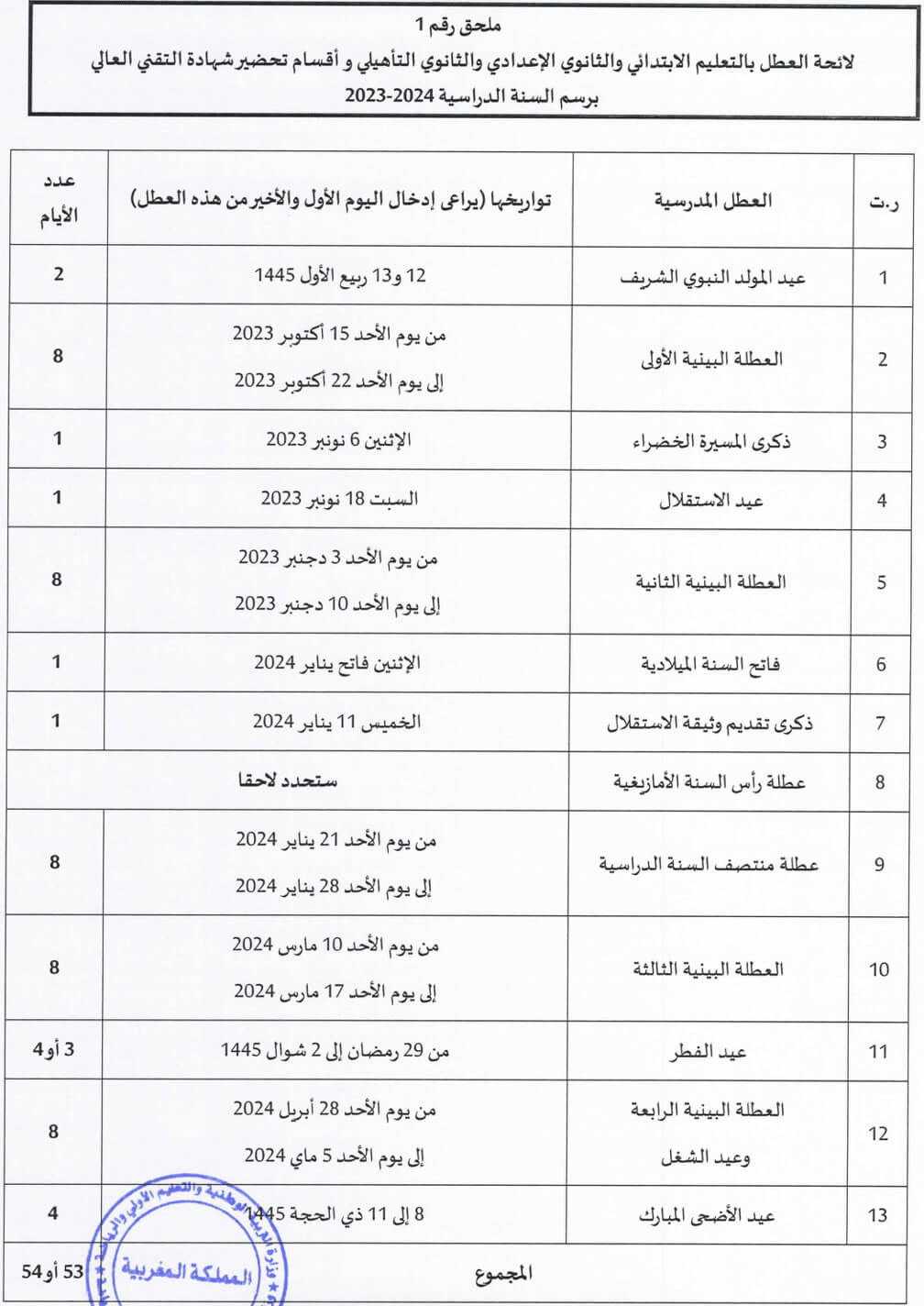 هدا و حسب برمجة ذات الوزارة ان الدراسة ستنتهي يوم الاحد 22 يوليو 2024 ، لتنطلق بعدها العطلة الصيفية التي ستتراوح مدتها 60 يوما .