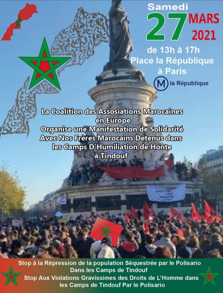 يستعد ائتلاف الجمعيات المغربية بأوروبا إلى تنظيم وقفة احتجاجية يوم السبت 27 مارس الجاري، في العاصمة الفرنسية باريس، تضامنا مع الصحراويين المغاربة المحتجزين في مخيمات تندوف.