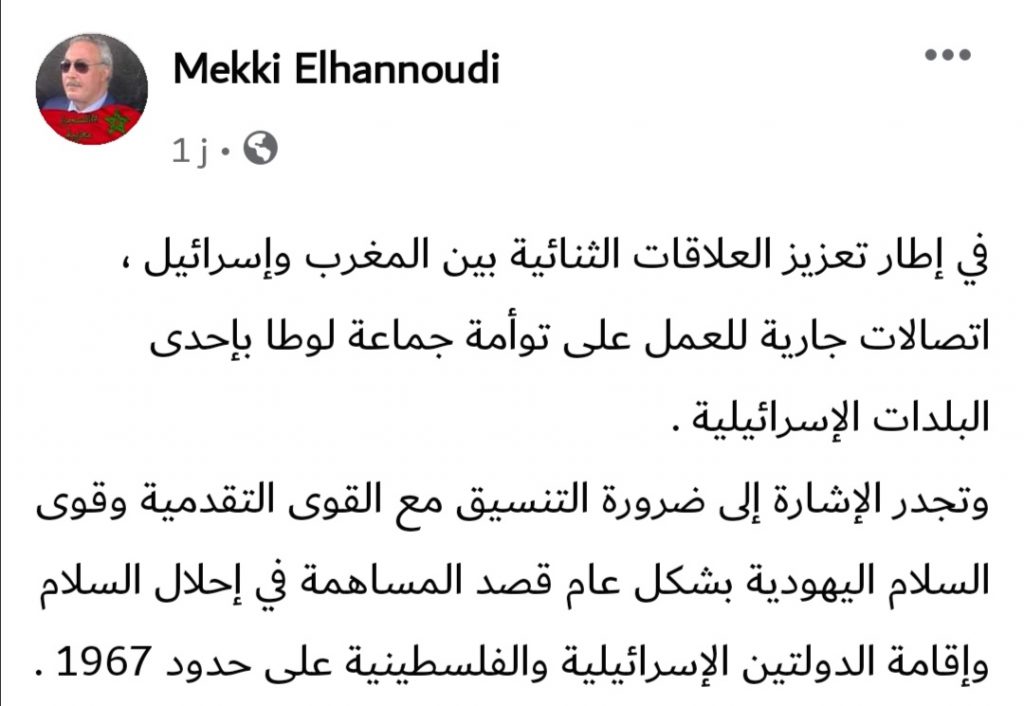 وعبر الحنودي على حائط حسابه بموقع “فايسبوك” قائلا: “في إطار تعزيز العلاقات الثنائية بين المغرب وإسرائيل ، اتصالات جارية للعمل على توأمة جماعة لوطا بإحدى البلدات الإسرائيلية”.
