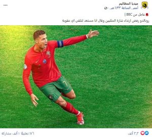 تتداول حسابات وصفحات على مواقع التواصل الاجتماعي، منذ 23 يونيو/حزيران الجاري، خبرًا يدعي أن موقع بي بي سي نشر خبرًا مفاده رفض اللاعب البرتغالي كريستيانو رونالدو ارتداء شارة المثليين وقوله “أنا مستعد لتلقي أي عقوبة”.