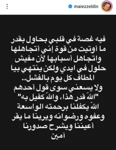 جدير بالذكر أن مي عز الدين كانت قد أحدثت قلقا جمهورها في شهر غشت الماضي عندما شاركت منشورًا غامضًا عبر إنستغرام تحدثت فيه عن مرورها بحالة نفسية صعبة، وكتبت حينها: “في غصة في قلبي، أحاول قدر المستطاع تجاهلها وتجاهل أسبابها، لأنني لا أملك حلولاً، لكن ينتهي بي الحال يوميًا بالفشل”.